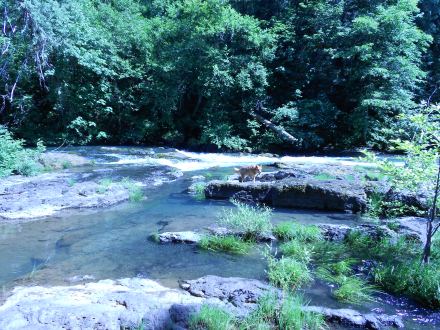 There’s a cliff behind me, but I got dizzy if I went any closer. This is our dog, Deco, who lives for running around in the forest or swimming in a river.